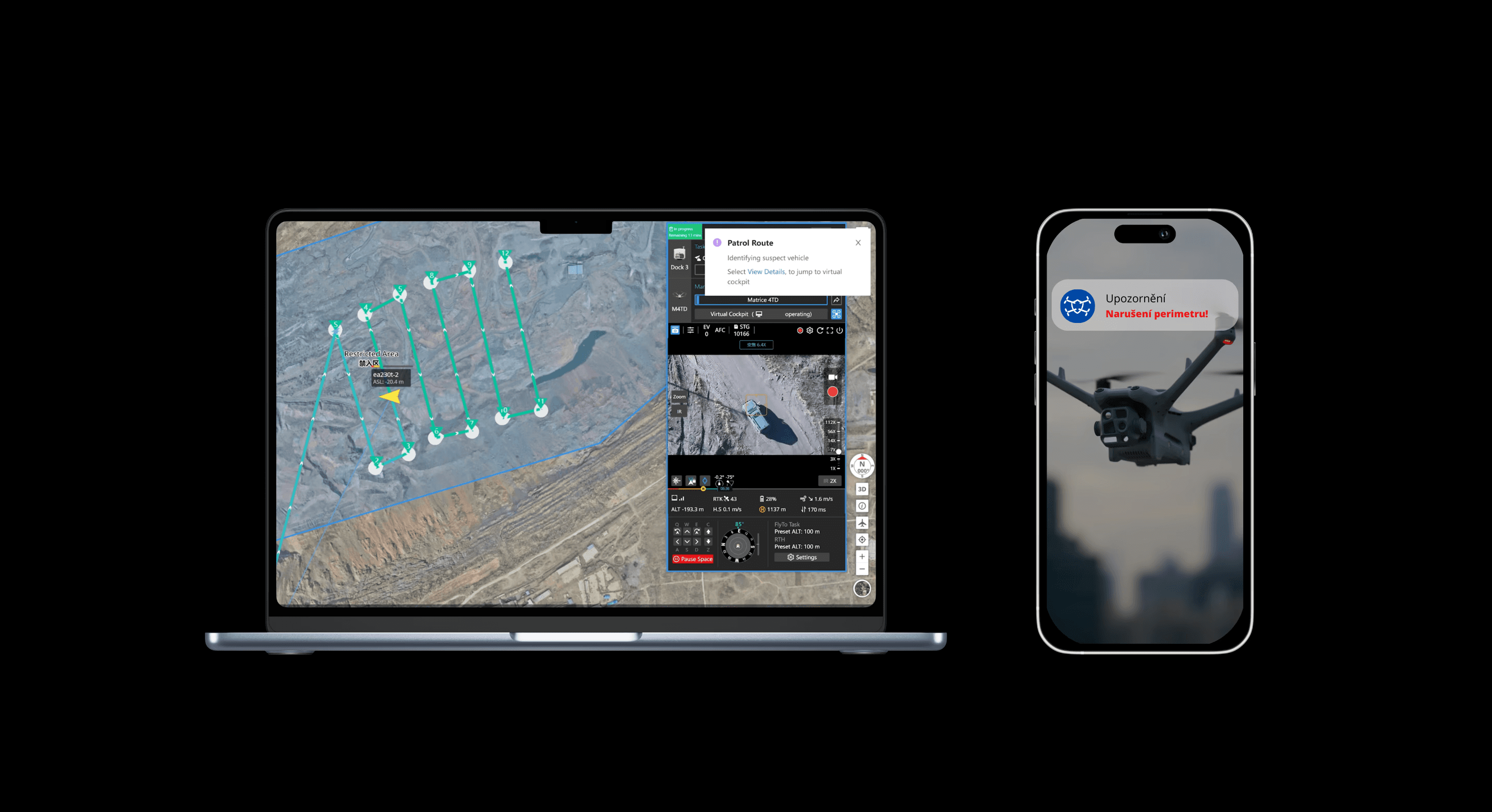 Dron automaticky hlídkuje ve zvolených intervalech ve dne i v noci.
